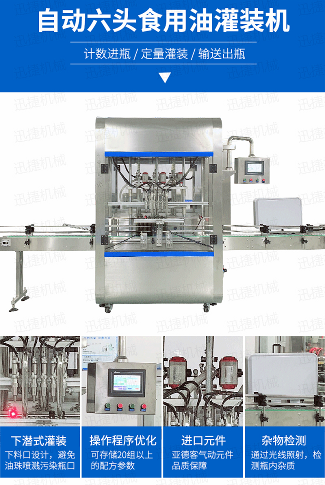 橄欖油灌裝旋蓋成套設備采用伺服柱塞式計量灌裝原理,適用于各種規格(0.1-1升可兼顧到2升灌裝)的南瓜籽油、榛子油、牡丹籽油、芝麻油、核桃油、山茶油、亞麻籽油、棉籽油、橄欖油、大豆油、玉米油、菜籽油等食用油灌裝。設備采用伺服系統定量推料,在人機界面數字化調節計量,并且可設定100ml或200ml等所需計量,觸摸屏一觸即達,而且可以單頭微調計量。操作簡單,維護方便,節省人工成本,生產效率更高。