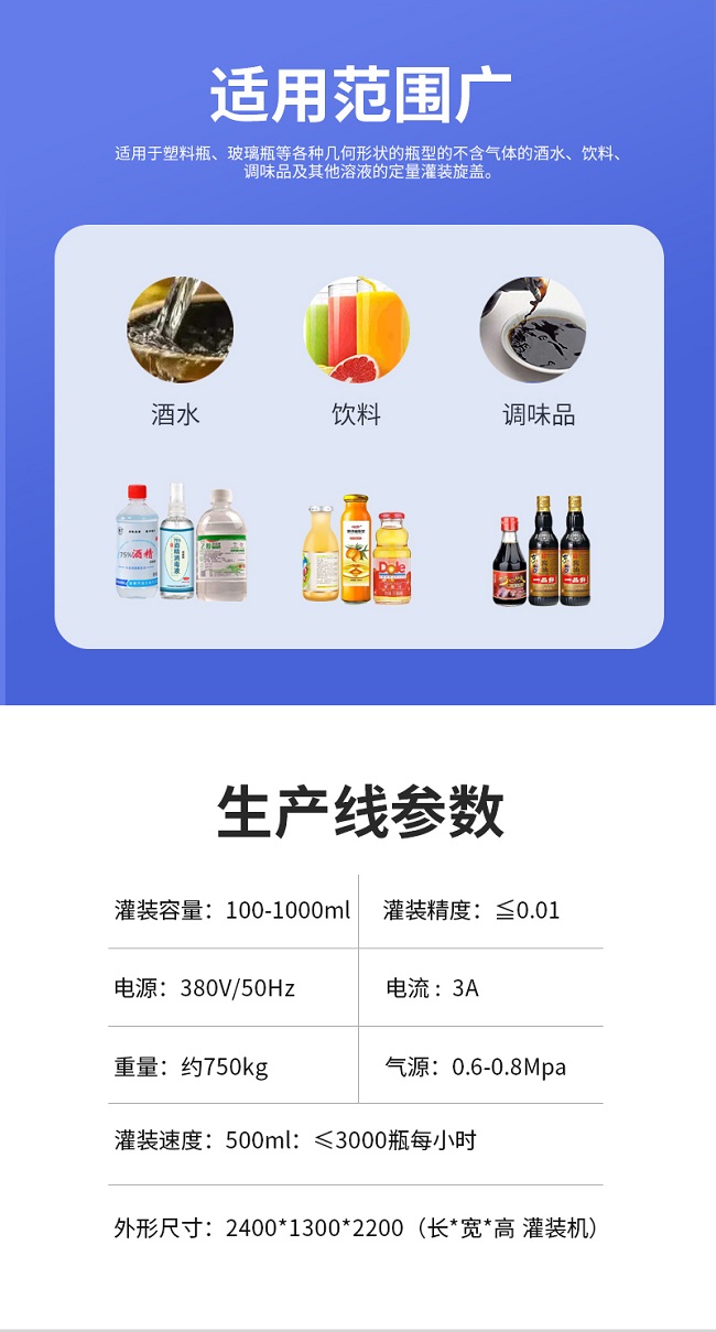 防爆液體酒精灌裝機是目前國內液體灌裝的高端產品,自動化程度高,灌裝計量精確,適用于塑料瓶、玻璃瓶等各種幾何形狀的瓶型的不含氣體的酒水、飲料、調味品及其他溶液的定量灌裝。機器采用觸摸屏代替傳統的按鈕操作,操作簡單、方便、直觀。科技含量高。機器灌裝計量可通過觸摸屏對灌裝時間的調整實現不同計量灌裝,方便操作者使用。