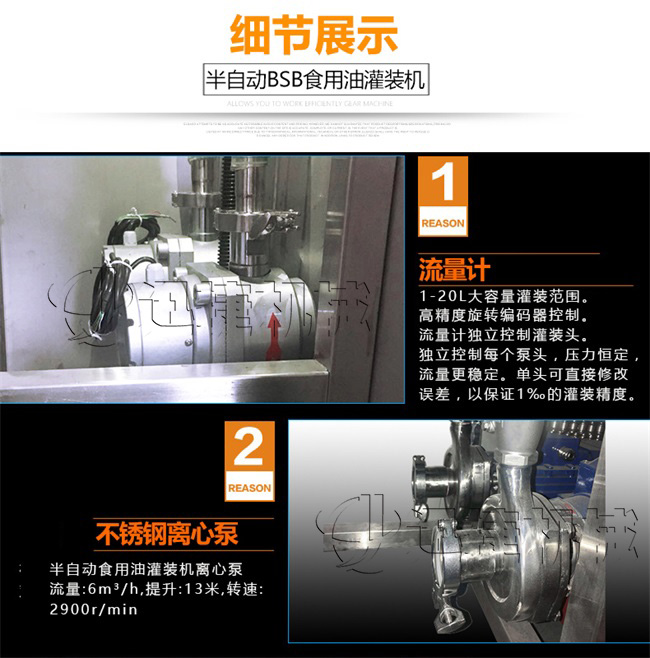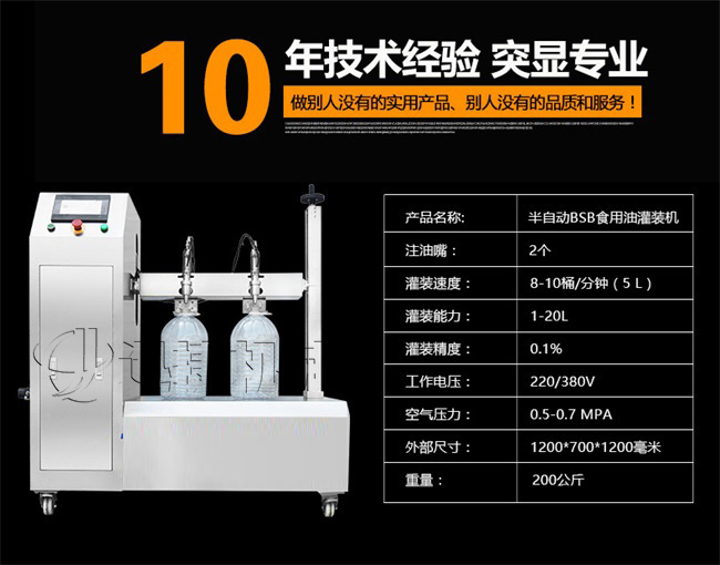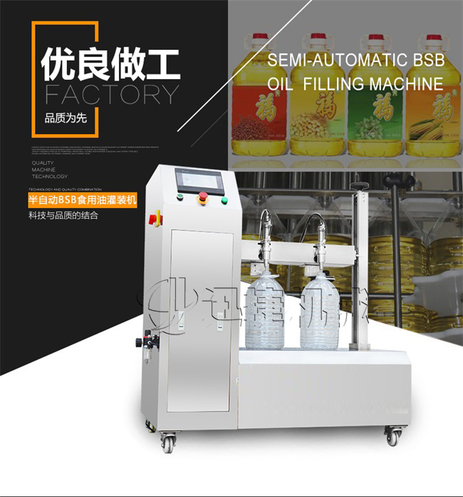 本機(jī)適用于花生油、大豆油、菜籽油、色拉油、芝麻油、石油化工潤滑油等各種油類和粘稠液體的定量要求。半自動(dòng)雙頭電動(dòng)BSB食用油灌裝機(jī):采用的微電腦技術(shù),自備動(dòng)力,管路無需加壓,節(jié)約運(yùn)行成本;自動(dòng)檢測油浙、自動(dòng)修正溫度變化引起的密度變化,適合大溫差環(huán)境的油品灌裝工作,使用方便靈活;機(jī)電一體化設(shè)計(jì),安裝方便,整機(jī)價(jià)格低廉。