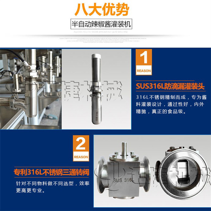 該半自動辣椒醬灌裝機(jī)適合于將各類粘稠體及含有各種固體物質(zhì)如辣椒、花生、肉塊、佐料等物體的醬類和油、料分離的火鍋底料等灌裝于各種容器中,適用于辣椒醬、顆粒醬料、大塊肉醬、火鍋底料等醬體的灌裝。